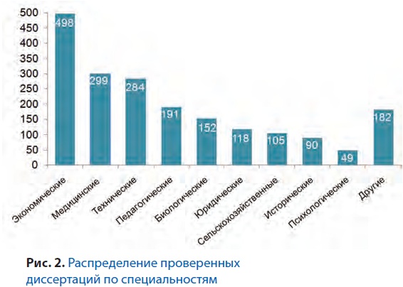 Подводя итоги пятилетней реализации проекта, можно утверждать, что в основном на проверку присылаются подготовленные к защите диссертации кандидатов и докторов наук. За время работы проекта были проверены 1968 текстов диссертаций, что составляет около 93% всех присланных на проверку документов. Наибольшее количество диссертаций было проверено по экономическим наукам (498 работ), медицинским наукам (299 работ), техническим наукам (284 работы), педагогическим наукам (191 работа) и биологическим наукам (152 работы) (рис. 2). Также эксперты РГБ проводили проверку НИР, НИОКР, рефератов, авторефератов, статей, магистерских работ и др.