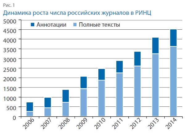 — Если говорить про научные журналы, то, наверное, можно уже сказать, что мы вышли на уровень, когда eLIBRARY охватывает практически всю российскую научную периодику, по крайней мере всю достойную внимания её часть. То есть фраза «если журнала нет в Научной электронной библиотеке или в РИНЦ, то его просто не существует» становится всё более актуальной. Это не значит, что рост количества журналов, представленных на платформе, прекратился. Хотя бы потому, что каждый год в стране рождаются около 250–300 новых журналов, которые также появляются на eLIBRARY.RU (рис. 1).