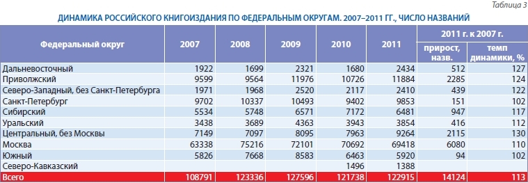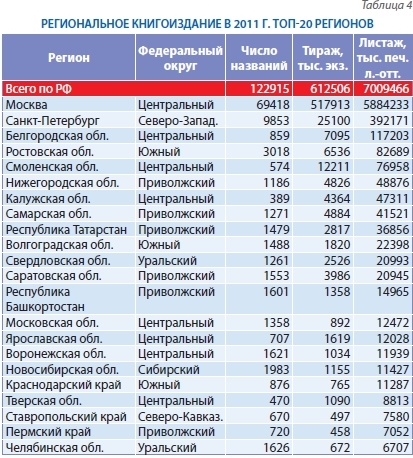 В то же время есть регионы, где наблюдается рост книгоиздания, например на Кавказе, притом там, где раньше издательств не было. Среди лидеров регионального книгоиздания – Ростовская, Смоленская, Калужская, Самарская, Волгоградская области, Белгородская, но там свои объективные причины. Динамичны в своём издательском развитии Нижегородская, Оренбургская, Брянская области (табл. 3, 4)