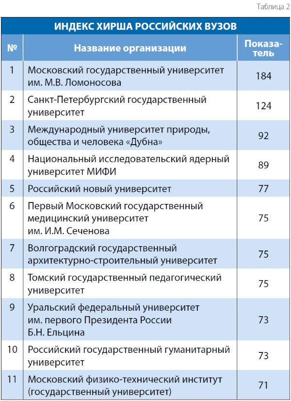 В то же самое время есть негосударственные вузы, которые государство признаёт эффективными. Они входят в солидные рейтинги, делают научные открытия и получают патенты. Достаточно взглянуть на первую пятёрку российских вузов по уровню научного цитирования (индекс Хирша), в которую входят университет «Дубна» (учредитель — Министерство образования Московской области) и Российский новый университет (частный вуз). У подавляющего большинства государственных вузов показатели наукометрии ниже (табл. 2).