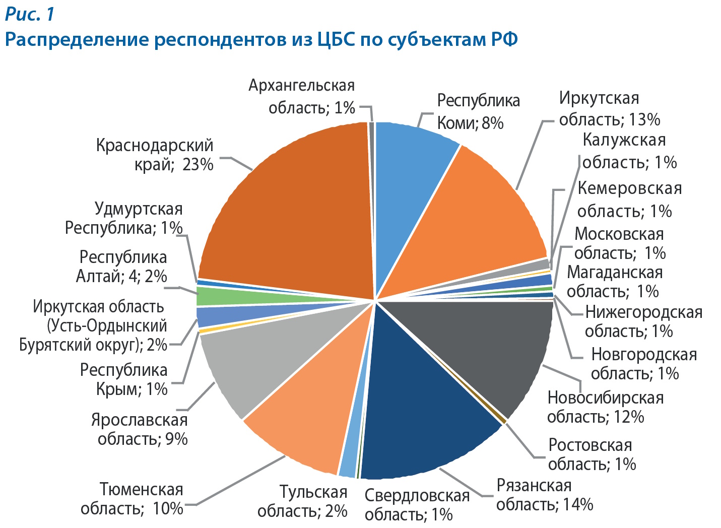 Число респондентов по сравнению с опросом прошлого года увеличилось почти в два раза, при этом наиболее активными были муниципальные библиотеки, прежде всего представители Краснодарского края (23%, 45 централизованных библиотечных систем, ЦБС), Рязанской (17%, 28 ЦБС), Иркутской (13%, 26 ЦБС) и Новосибирской (12%, 23 ЦБС) областей, Республики Коми (8%, 16 ЦБС), Тюменской (10%, 20 ЦБС) и Ярославской (9%, 17 ЦБС) областей (рис. 1).