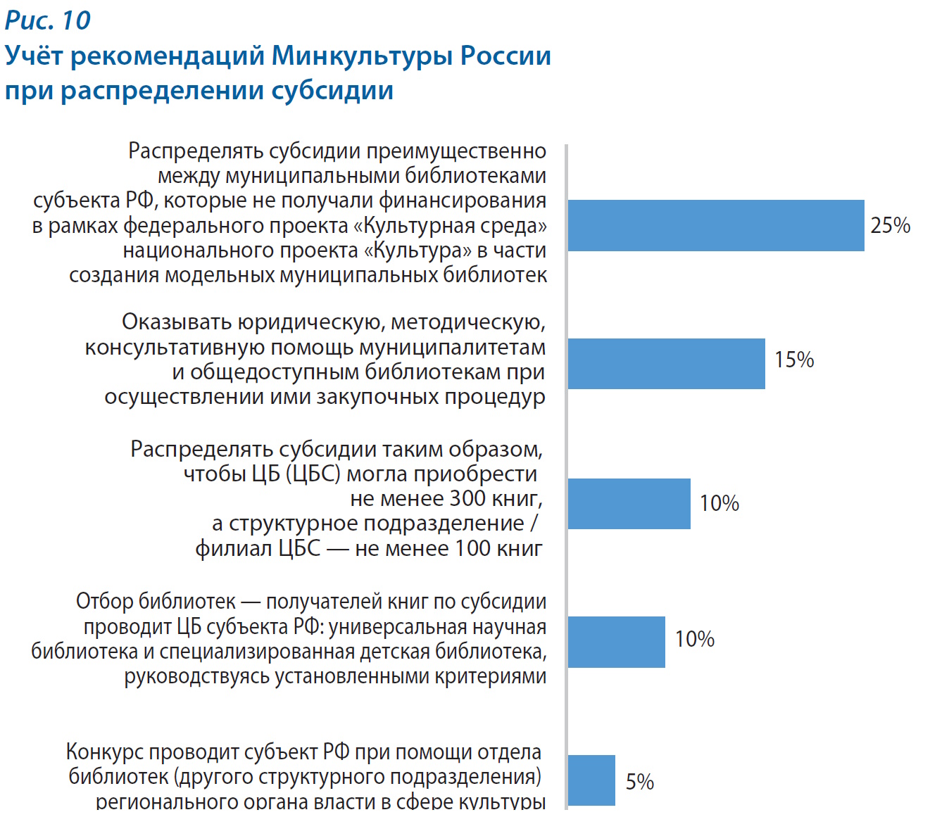 При распределении субсидии на поддержку комплектования для муниципальных библиотек учитывались рекомендации Минкультуры России (рис. 10). Большинство библиотек следует рекомендации по приоритетному распределению субсидии между библиотеками, которые не получали финансирования в рамках проекта «Культура».