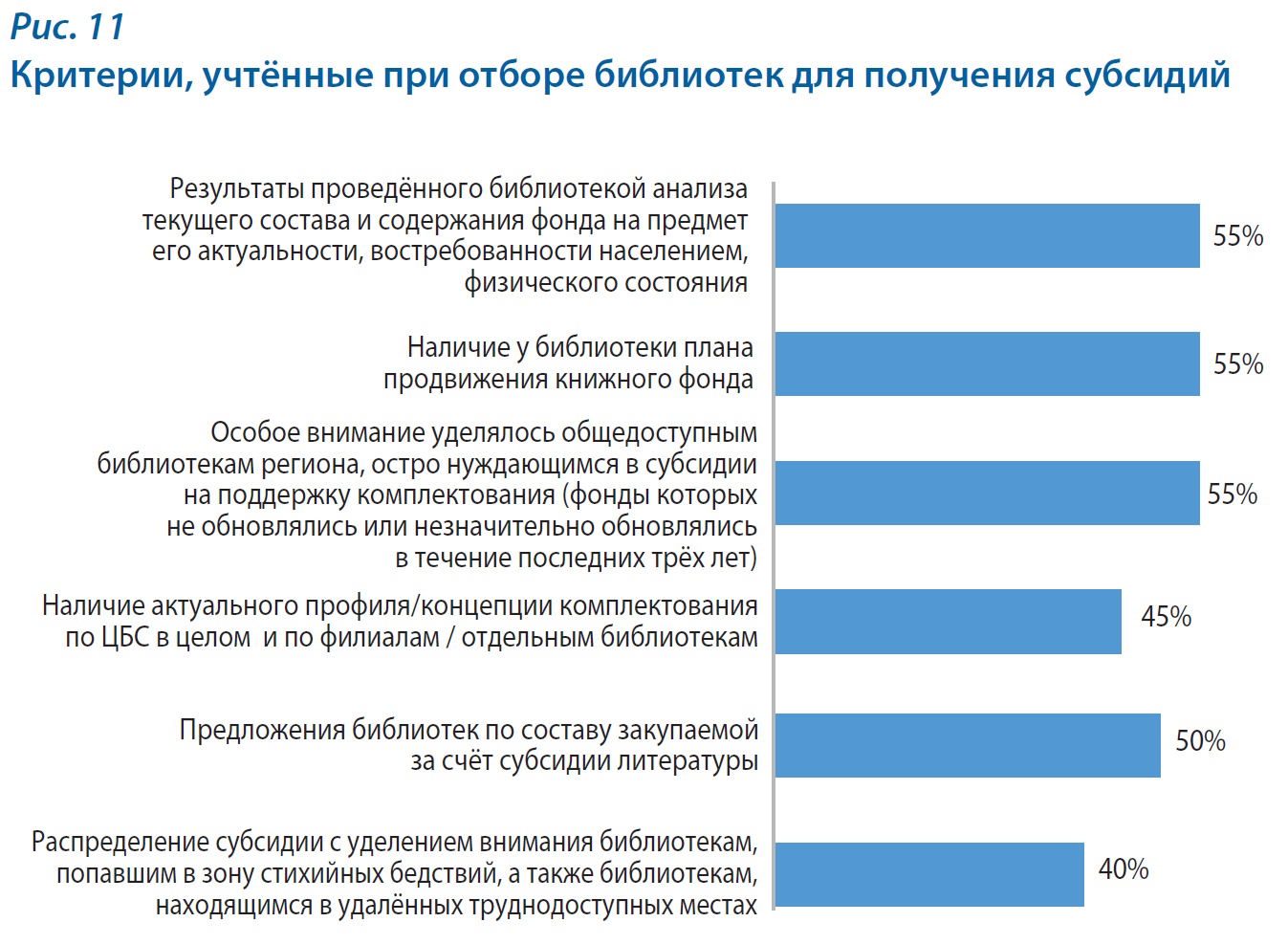 Как и в предыдущем году, при отборе библиотек для получения субсидии учитывались результаты проведённого библиотекой анализа текущего состава и содержания фонда, его актуальности и востребованности, а также физического состояния (55%). Важным критерием являлось наличие у библиотеки плана продвижения фонда (55%) и актуального профиля комплектования (45%). Учитывались предложения библиотек по составу литературы, закупаемой за счёт субсидии (50%). Особое внимание респонденты уделяли библиотекам, остро нуждающимся в получении субсидии (фонды не обновлялись в течение последних трёх лет, 55%); а также библиотекам, попавшим в зону стихийного бедствия или находящимся на удалённых труднодоступных территориях (40%, рис. 11).