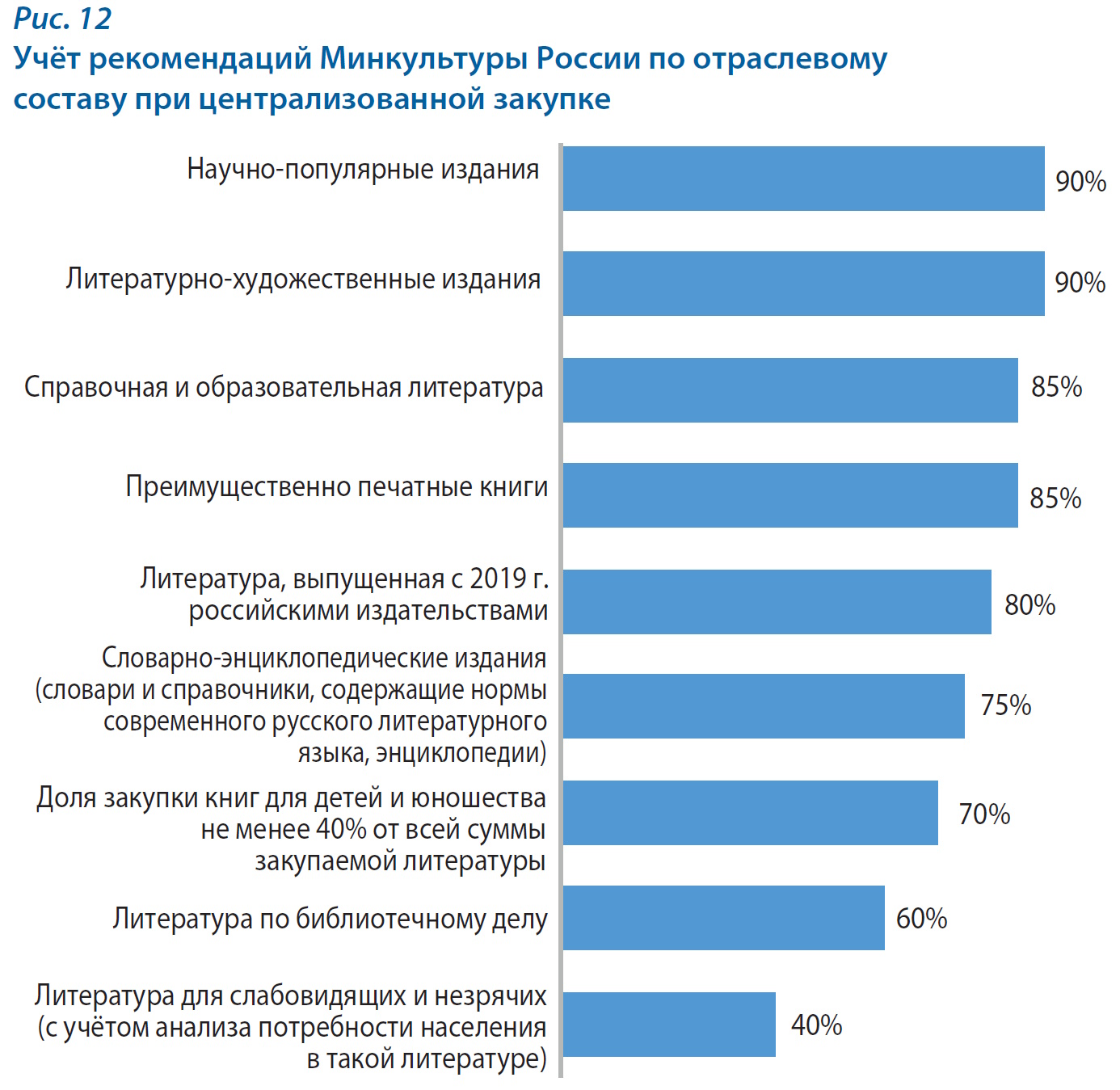 Рекомендации Минкультуры России по отраслевому составу закупаемой литературы поддержало большинство респондентов (рис. 12). Преимущественно закупались печатные книги (85%), выпущенные с 2019 г. по 2022-й (80%). Особое внимание было уделено закупке научно-популярных изданий (90%) и художественной (90%), справочной и образовательной (85%), справочно-энциклопедической (75%) литературы. Закупку детских книг (не менее 40%) и литературы для слепых и слабовидящих поддержали 40% опрошенных, а закупку изданий по библиотечному делу — 60%.