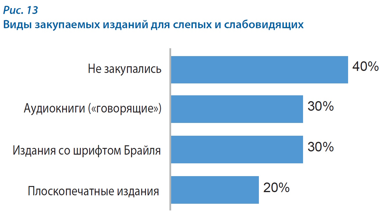 Отмечена тенденция снижения объёмов закупки литературы для слепых и слабовидящих по сравнению с прошлым годом. В результате отдельного анализа востребованности таких изданий у населения большинство респондентов назвали аудиокниги (30%), издания со шрифтом Брайля (30%) и плоскопечатные книги (20%). 40% сообщили, что такая литература для фондов муниципальных библиотек не закупалась, отметив в комментариях, что в регионе для этого есть специализированная библиотека с соответствующим фондом, которая занимается обслуживанием данной категории читателей (рис. 13).