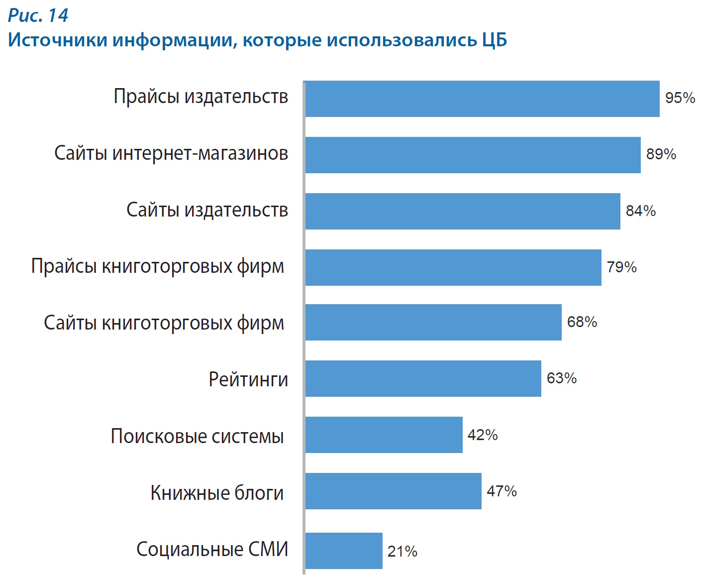 В качестве источников информации при централизованной закупке ЦБ региона чаще всего использовали прайсы издательств и книготорговых фирм (95 и 79%), сайты интернет-магазинов (89%), издательств и книготорговых фирм (84 и 68%), рейтинги (63%). В гораздо меньшей степени —книжные блоги (47%), поисковые системы (42%) и социальные книжные сети, экспертные каталоги и навигаторы (21%, рис 14).