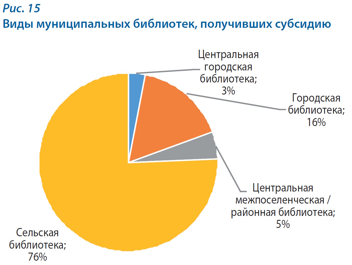 По данным респондентов (рис. 15), всего поддержку на комплектование получили 3450 муниципальных библиотек, в том числе 2611 сельских (76%).