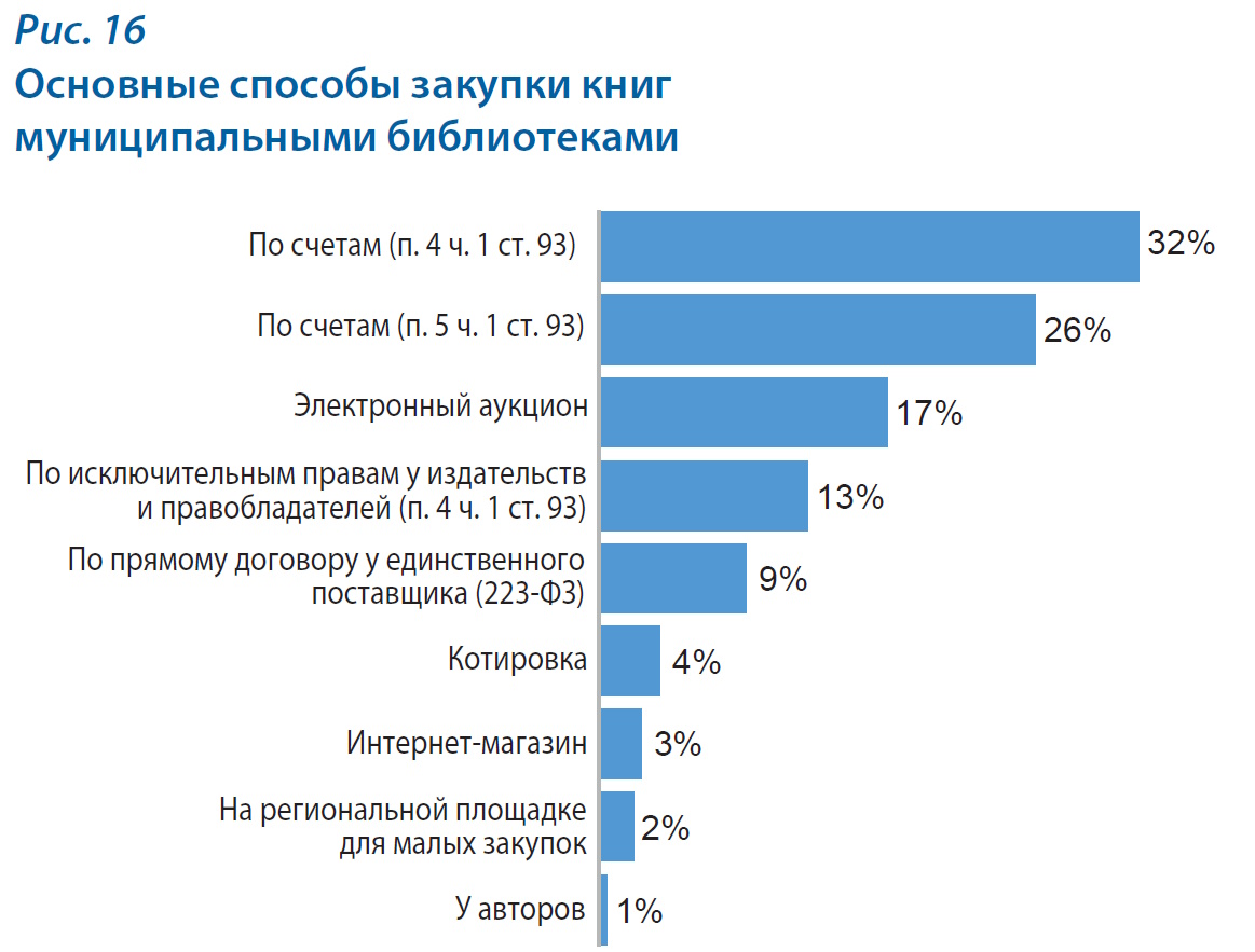Из анализа ответов респондентов следует, что основным способом самостоятельного приобретения книг муниципальными библиотеками стала закупка у единственного поставщика (ч. 1 ст. 93) — 72%, в том числе 58% — по счетам (32% по п. 4 и 26% —по п. 5), 13% — по исключительным правам у издательств (п. 14), у авторов — 1% (п. 13). На электронный аукцион приходится 17% закупок, на котировки — 4% (рис. 16). Таким образом, закупка в основном происходит по счетам. Это приводит к тому, что издательства, за исключением крупных игроков, не ощущают какого-либо влияния выделения субсидии на поддержку комплектования библиотек.
