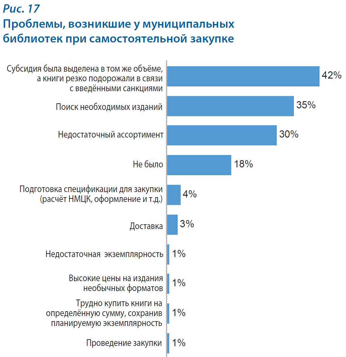 Возникали проблемы, связанные с поиском изданий (35%) и недостаточным ассортиментом (30%). 18% респондентов ответили, что проблем при закупке не выявлено. Среди затруднений при поиске необходимых изданий специалисты называют ограниченный ассортимент у единственного поставщика, недостаток изданий в необычных форматах и высокие цены. Последняя проблема вынуждает сотрудников искать нестандартные решения: «…в связи с подорожанием книг не все необходимые издания удалось приобрести, хотя уложились в рекомендованную цену (500 рублей). Средняя стоимость книги составила 408 рублей за счёт брошюр (изданий до 48 с.), цена которых в три-четыре раза ниже книжной» (МУК Межпоселенческая библиотека имени Н.С. Гумилёва Шиловского муниципального района Рязанской области).
