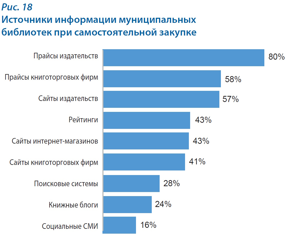 Анализ рис. 18 показывает, что большинство библиотек использовали в качестве источников информации для комплектования прайсы издательств (80%) и книготорговых фирм (58%), сайты издательств (57%), интернет-магазинов (43%), книготорговых фирм (41%), рейтинги (43%).