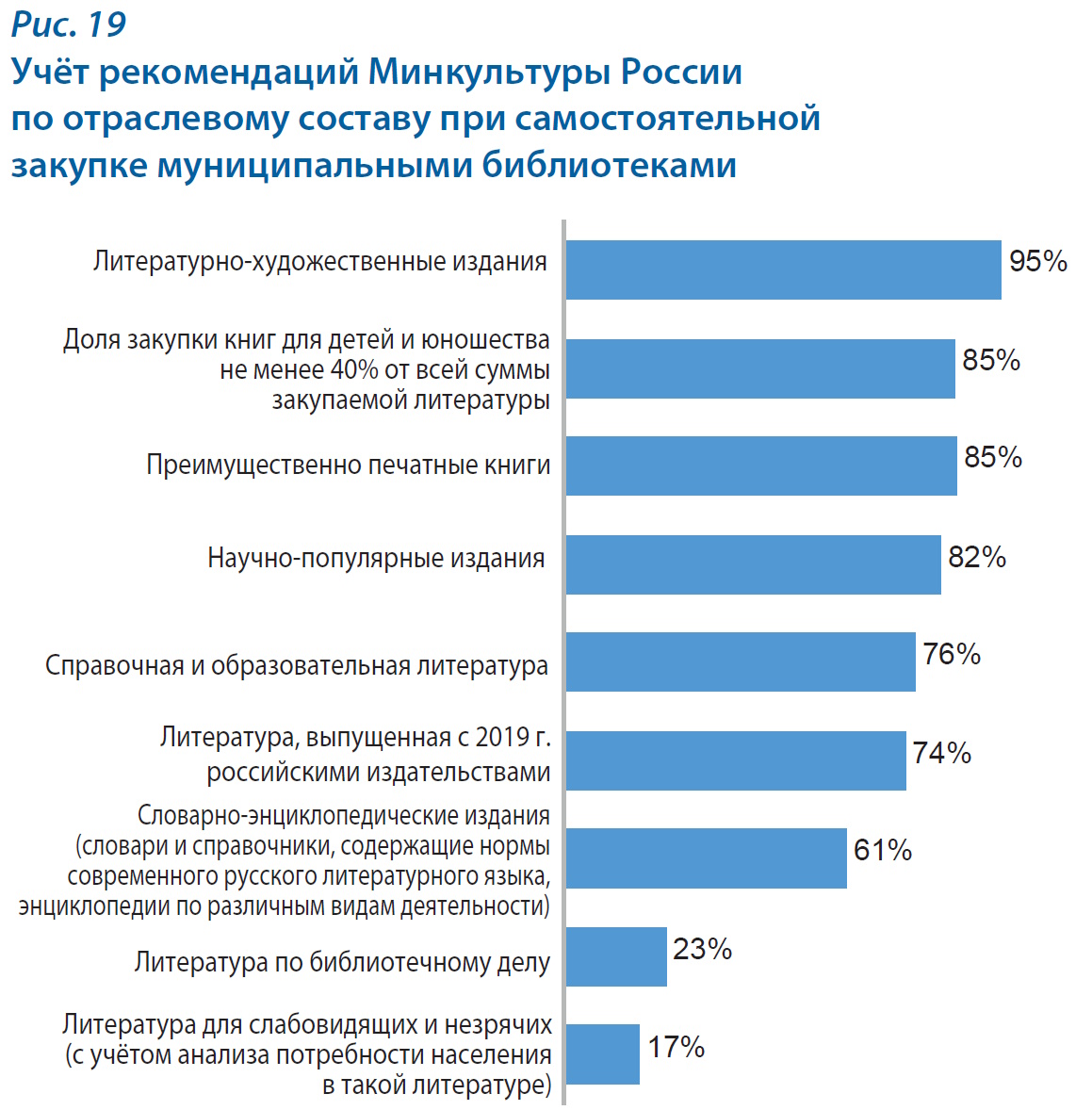 Как и в 2022 г., рекомендации Минкультуры России поддержаны большинством специалистов муниципальных библиотек, однако литературу по библиотечному делу приобретали лишь 23% респондентов, а книги для слепых и слабовидящих —17% (рис. 19).