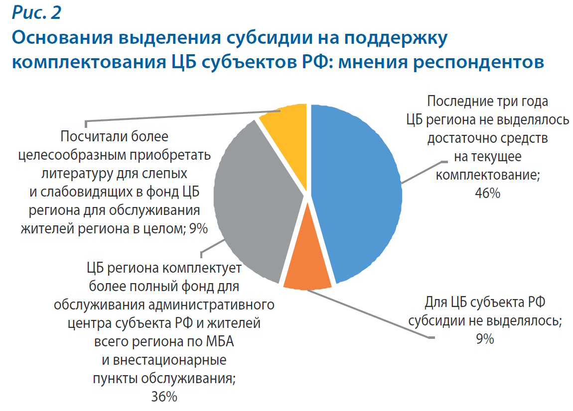 Как показал анализ, 46% респондентов считают, что отсутствие достаточного финансирования на комплектование в последние три года стало основной причиной, по которой в регионах было принято решение о выделении средств на поддержку комплектования ЦБ субъектов РФ.