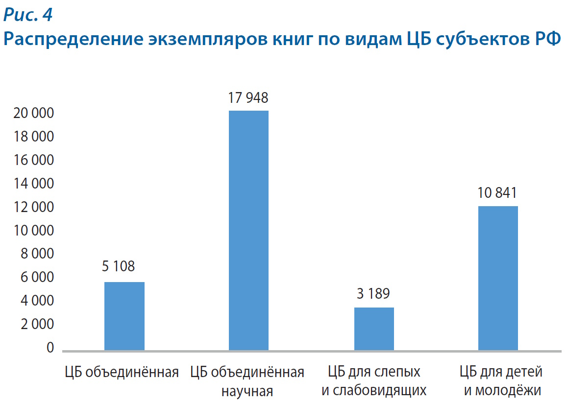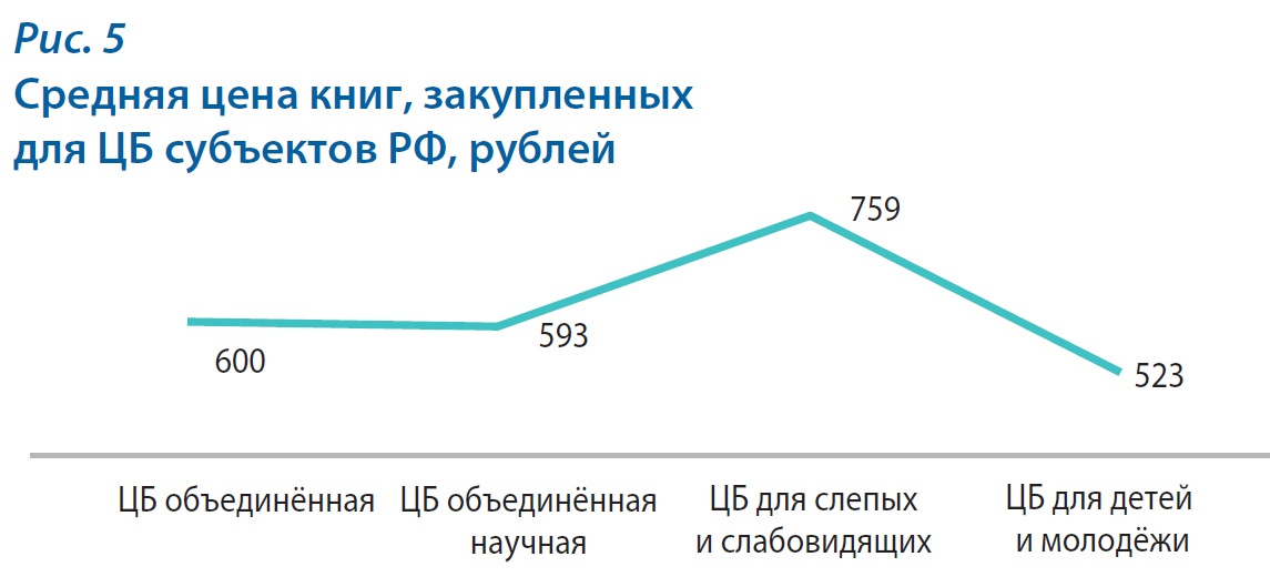 Более высокая экземплярность приобретённых книг у детских ЦБ субъектов РФ, как и низкая экземплярность у ЦБ для слепых и слабовидящих, объясняется разницей в средней цене приобретаемых изданий. Как и в прошлом году, издания для детей оказались наиболее выгодными для приобретения в отличие от дорогих книг для слепых и слабовидящих (рис. 4–5).