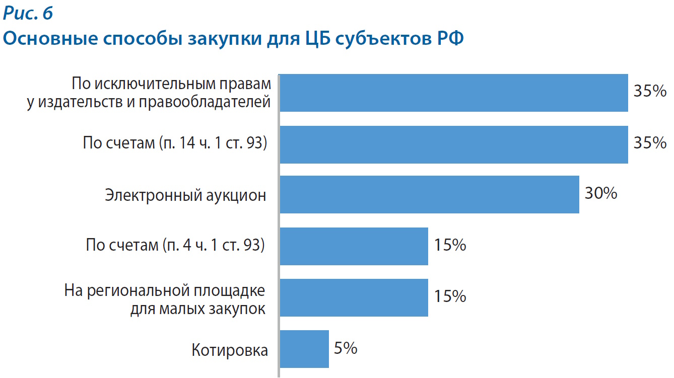 Как показывает анализ данных рис. 6, в 2023 г. преимущественными способами приобретения книг для ЦБ субъектов РФ стали закупка у единственного поставщика: по исключительным правам (п. 14 ч. 1 ст. 93 — 35%) и по счетам (п. 5 ч. 1 ст. 93 — 35%; п. 4 ч. 1 ст. 93 — 15%). На втором месте со значительным отрывом электронный аукцион (30%). На региональной площадке для малых закупок закупали книги 15% респондентов. 5% закупок были произведены через котировку.