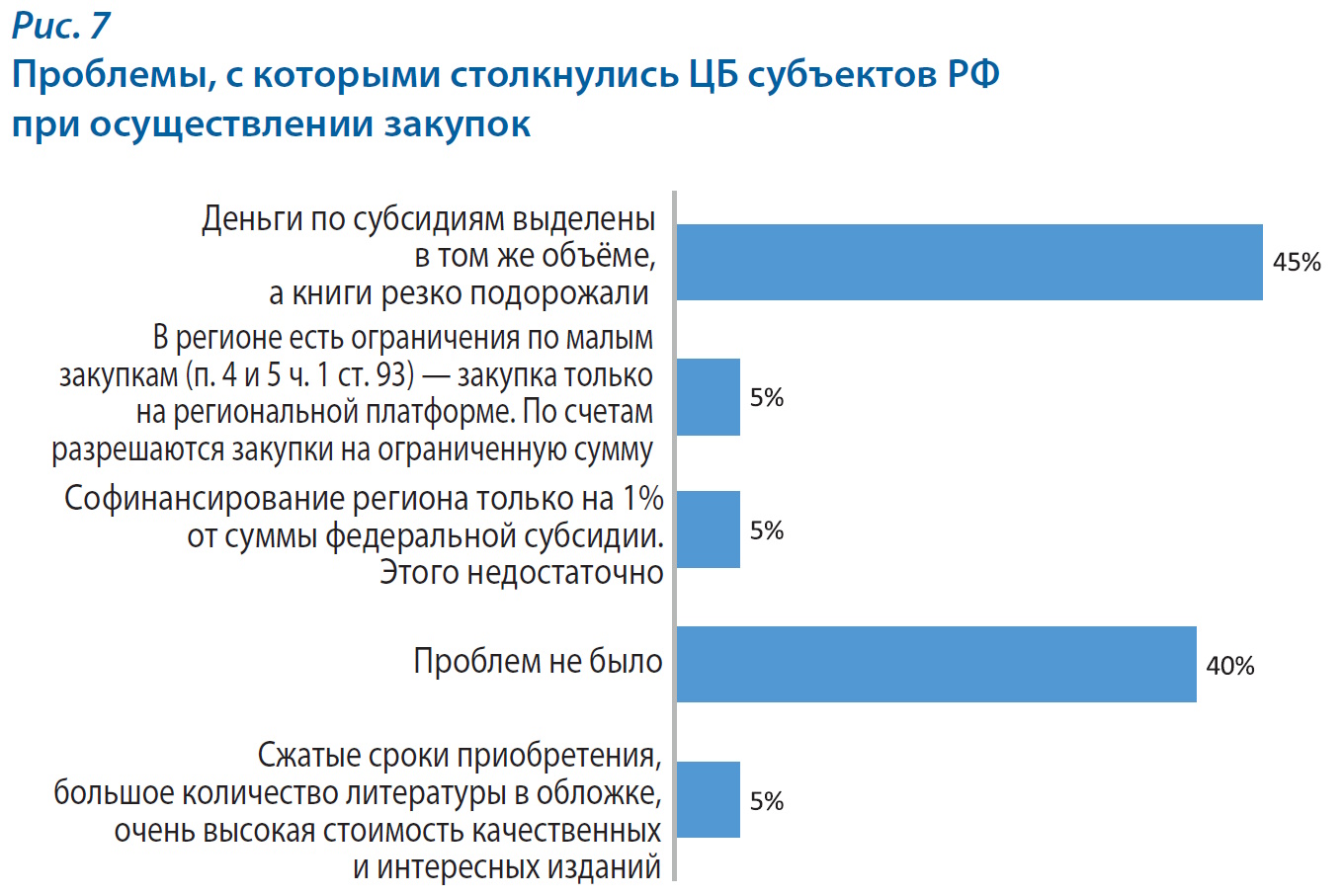 5% опрошенных подчеркнули, что в их регионах продолжают действовать ограничения по малым закупкам (по п. 4 и 5 ч. 1 ст. 93 — до 600 тыс. рублей): только на региональной платформе. По счетам разрешаются закупки на ограниченную сумму. В прошлом году на эту проблему указал 21% респондентов. 5% участников мониторинга также отметили низкий уровень софинансирования региона: лишь на 1% от федеральной субсидии, сжатые сроки приобретения изданий, большое количество изданий, выходящих в обложках, очень высокую стоимость качественных и интересных изданий (рис. 7).