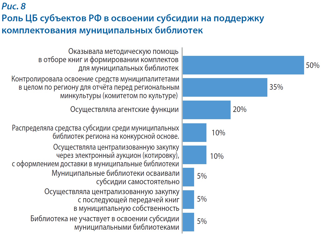 Как отметили 50% респондентов, основная роль ЦБ субъектов РФ при освоении субсидии на поддержку комплектования муниципальных библиотек заключалась в методической помощи в отборе книг и формировании комплектов для муниципальных библиотек. Библиотеки также контролировали освоение средств муниципалитетами в целом по региону для отчёта перед региональным минкультуры (35%). Распределение субсидии на закупку книг и централизованную закупку для муниципальных библиотек осуществляли 10% опрошенных. 10% библиотек производили централизованную закупку через электронный аукцион с доставкой в муниципальные библиотеки (рис. 8).