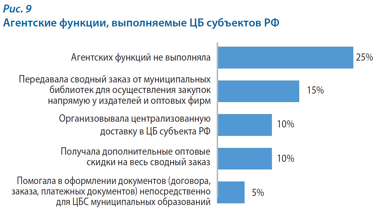 ЦБ регионов осуществляли в отношении муниципальных библиотек ряд агентских функций: передавали сводный заказ для реализации закупок напрямую у издательств и оптовых фирм (15%), организовывали централизованную доставку в ЦБ субъекта РФ (10%), получали дополнительные оптовые скидки на весь сводный заказ от региона (10%), помогали в оформлении документов для ЦБС муниципальных образований (5%). 25% участников опроса данных функций не выполняли (рис. 9).