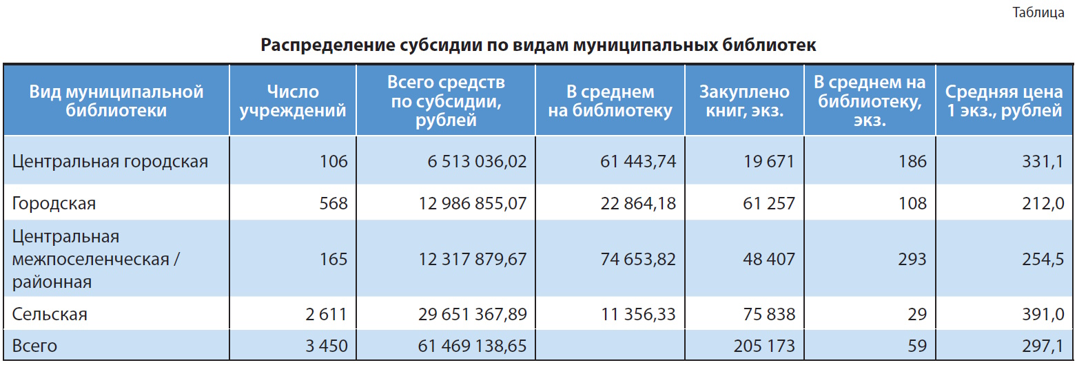 Анализ таблицы показывает, что сельские библиотеки получили поддержку в среднем на библиотеку в размере 1,4 тыс. рублей и смогли закупить 29 книг на библиотеку, а городские библиотеки-филиалы — около 23 тыс. и порядка 108 книг на библиотеку. ЦБ ЦБС повезло больше: центральным городским библиотекам досталось 186 книг; центральным районным —293. Таким образом, получается, что рекомендация Минкультуры России условно выполняется только в случае закупки для центральных районных и межпоселенческих библиотек, а на основную часть библиотек, наиболее приближенную к населению и представленную сельскими библиотеками, почти никак не влияет.
