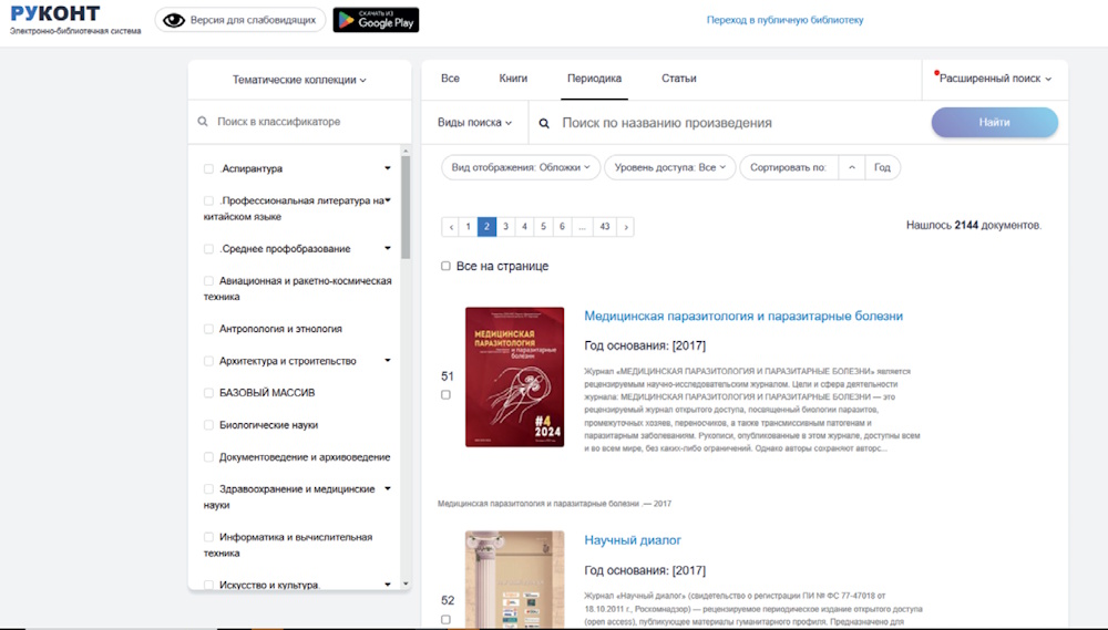 В ЭБС РУКОНТ организован поиск как по книгам, так и по периодике. По умолчанию установлен поиск «Все», т.е. и по книгам, и по периодике. Если в верхнем горизонтальном меню выбрать «Периодика», то вы увидите, что в базе данных имеется более 2 тыс. журналов и газет (рис. 2).