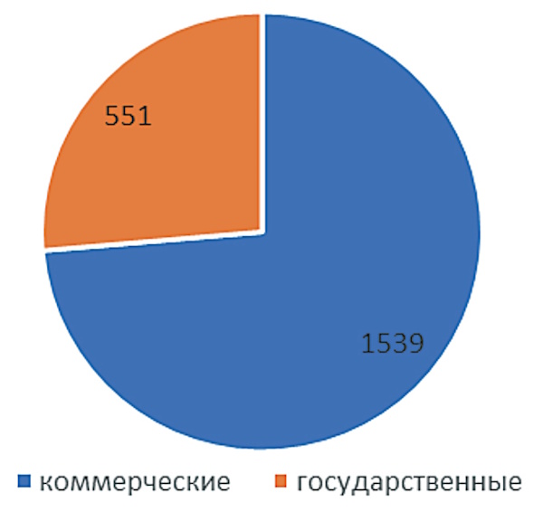 Рисунок 4 демонстрирует соотношение периодических изданий, выпускаемых коммерческими издательствами, а также государственными вузами и НИИ.