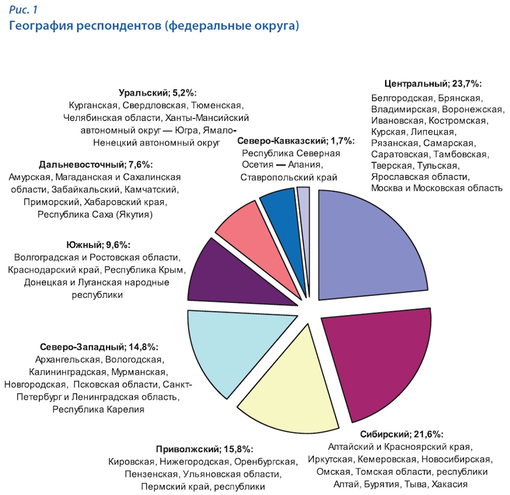 В исследовании приняли участие респонденты из 298 образовательных организаций. В выборке были представлены все федеральные округа России (рис. 1). При этом большинство составили колледжи из Центрального, Сибирского, Приволжского и Северо-Западного федеральных округов.