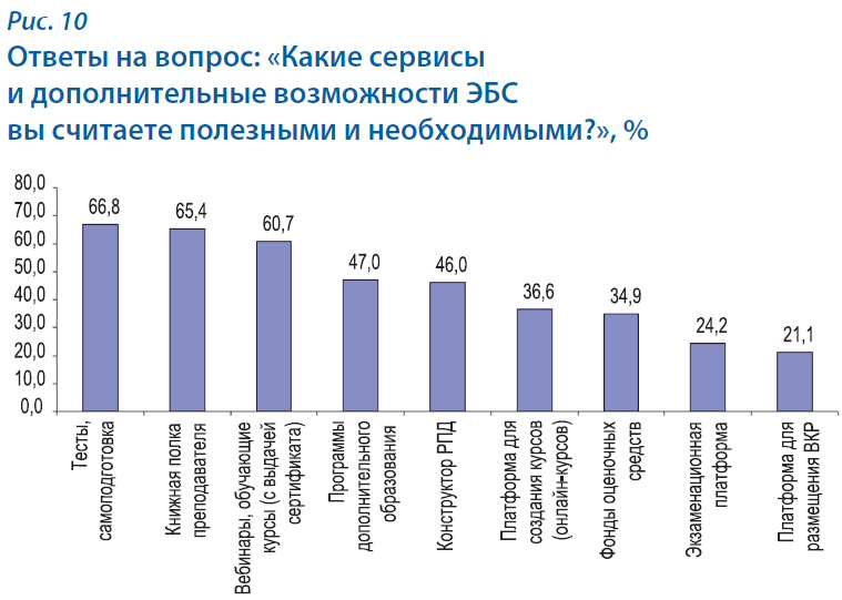 Вне зависимости от ответа на этот вопрос респонденты считают необходимыми и полезными сервисы, представленные на рис. 10. Анализ показывает, что в тройке лидеров — тесты, книжная полка преподавателя, вебинары и обучающие курсы (с выдачей сертификата).