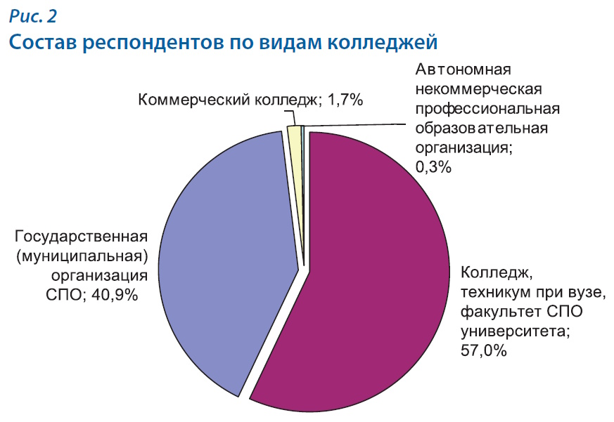Более половины опрошенных (57%) представляли колледжи и техникумы при высших учебных заведениях, а также факультеты СПО университетов (в дальнейшем будем называть их вузовскими). 40,9% составили бюджетные (государственные и муниципальные) колледжи. В незначительной степени в выборку вошли коммерческие и автономные некоммерческие образовательные учреждения (рис. 2).