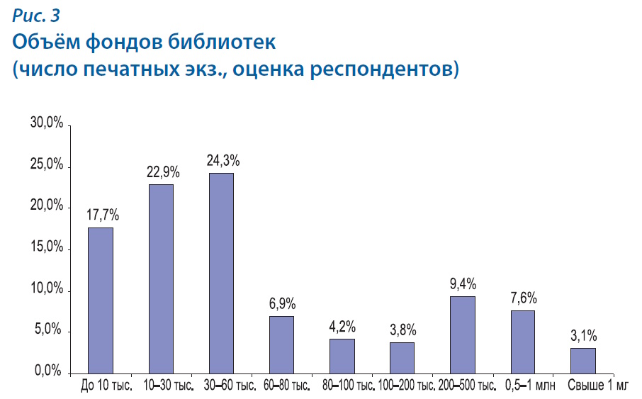 Анализ рис. 3 показывает, что почти 2/3 участников опроса (64,9%) располагают библиотеками, насчитывающими в своём составе до 60 тыс. экз. печатных изданий, и лишь 10,7% обладают фондом, превышающим 500 тыс. экз.