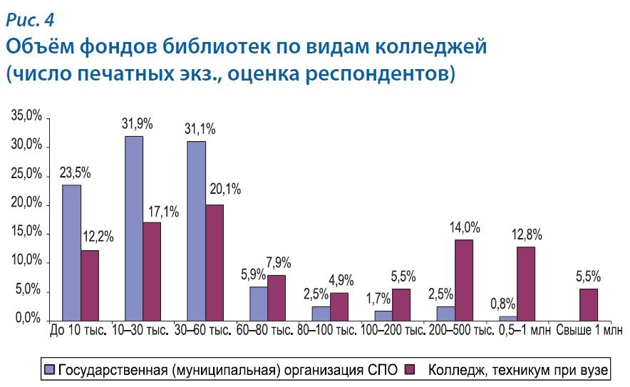 Представляет интерес анализ объёма фонда в зависимости от вида образовательной организации (рис. 4). При этом следует отметить, что вузовские колледжи пользуются возможностями библиотеки университета, поэтому 18,3% от их числа ответили, что в их фондах свыше 500 тыс. экз. печатных книг (среди «самостоятельных» бюджетных организаций СПО таковых всего 0,8%). При этом среди вузовских колледжей, по оценке опрошенных, почти половина (49,4%) располагают небольшими фондами (до 60 тыс. экз.), хотя у «самостоятельных» бюджетных организаций такие библиотеки составляют подавляющее большинство (86,6%).