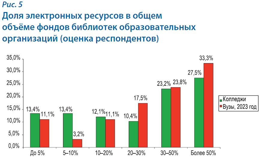 Как показывает анализ рис. 5, в целом колледжи меньше ориентированы на комплектование фондов электронными ресурсами, чем вузы, однако их отставание можно считать незначительным: если цифровой контент, по оценке опрошенных, занимает долю в 30% и более в 57,1% библиотек вузов (согласно опросу 2023 г.), то колледжи по тому же критерию составляют 50,7%.