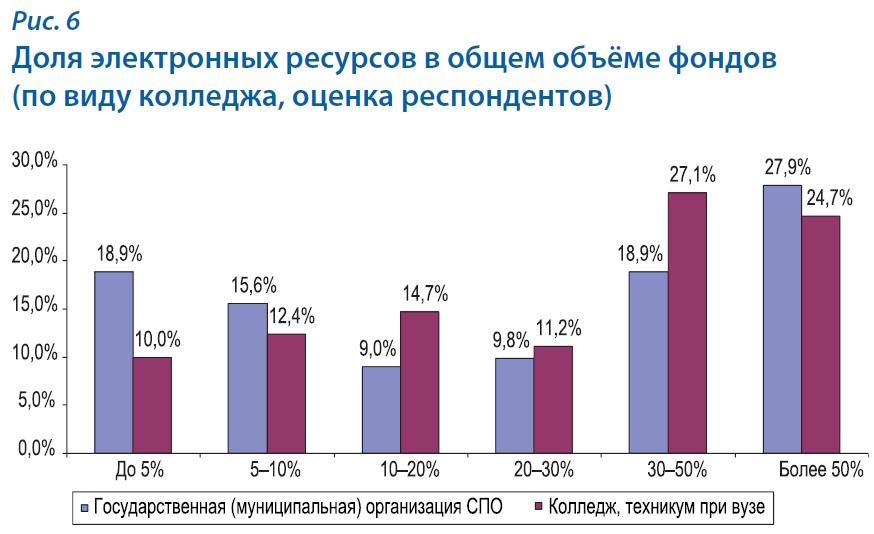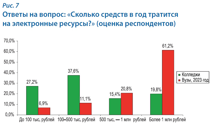 Очевидно, что в значительной степени вузовские колледжи обладают возможностью пользоваться фондами университетских библиотек и это отразилось в ответах респондентов относительно объёмов печатных изданий, доли электронных ресурсов в составе фонда и бюджетов, выделяемых на комплектование цифровым контентом. Так, до 500 тыс. рублей ежегодных бюджетов на электронные ресурсы выделяют 86,9% «самостоятельных» колледжей (38,3% вузовских), более 500 тыс. рублей — 51,2% вузовских и лишь 13,1% «самостоятельных».