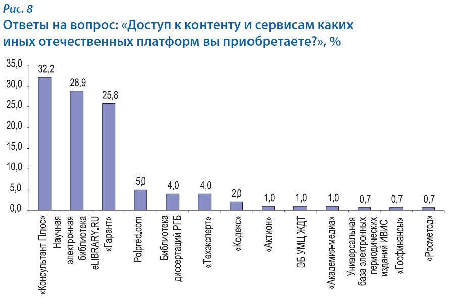 Как показывает анализ рис. 8, помимо указанных выше ЭБС 32,2% респондентов приобретают доступ к базе данных «Консультант Плюс», 28,9% — к Научной электронной библиотеке eLIBRARY.RU, 25,8% — к базе данных «Гарант». Помимо представленных на диаграмме ресурсов опрошенные называли также ЭБС издательства «Музыка» E-MUSICA, «Информио», систему «Главная медсестра», ЭБС Учебно-методического центра железнодорожного транспорта, «Проф-Либ».