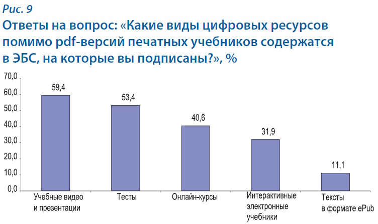 Осведомлённость респондентов относительно контентного наполнения ЭБС, а значит, косвенно и востребованность этих видов контента иллюстрируют данные рис. 9.