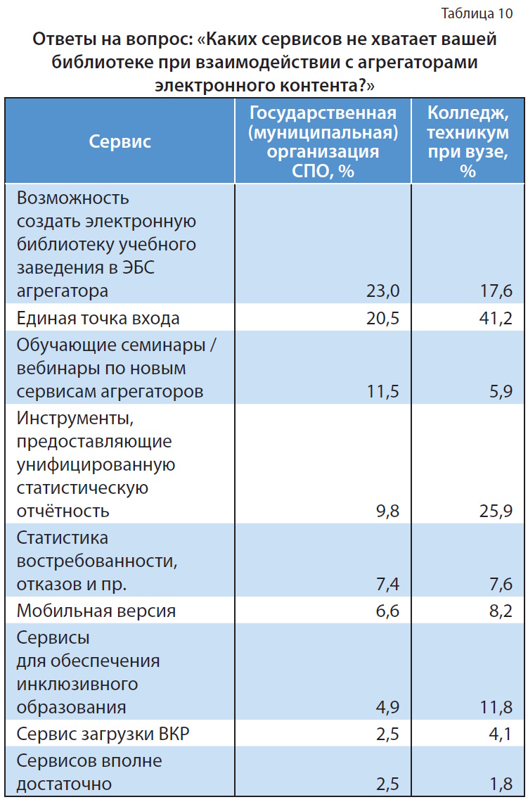 Ответы на вопрос: «Каких сервисов не хватает вашей библиотеке при взаимодействии с агрегаторами электронного контента?» — представлены в табл. 10.