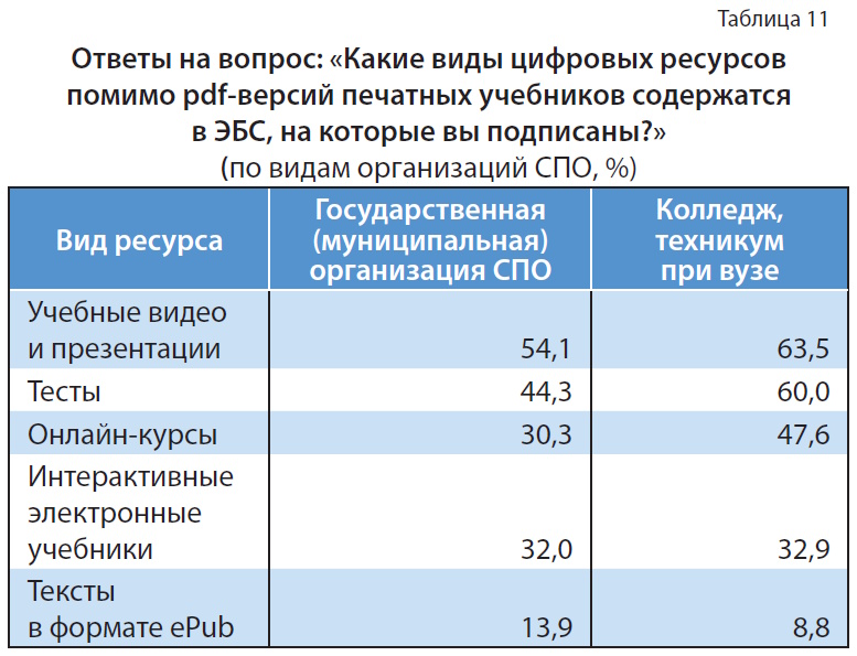 В то же время имеют место существенные различия между государственными организациями СПО и колледжами при вузах (табл. 11). В частности, респонденты из вузовских учреждений СПО чаще называли учебные видео и презентации, тесты и онлайн-курсы.