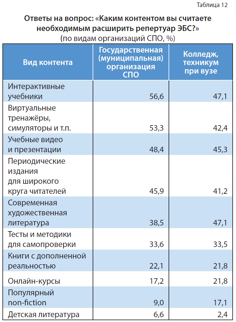 Что касается контента цифровых библиотек, то оценки респондентов указывают на недостаточность в портфелях агрегаторов таких видов электронных ресурсов, как интерактивные учебники, виртуальные тренажёры и симуляторы, учебные видео и презентации, периодические издания для широкого круга читателей, и прежде всего для «самостоятельных» учреждений СПО. Кроме того, держателям ЭБС целесообразно обратить внимание на репертуар современных издательств художественной литературы, однако для уточнения потребности по жанрам и форматам необходимо проводить дополнительные опросы.