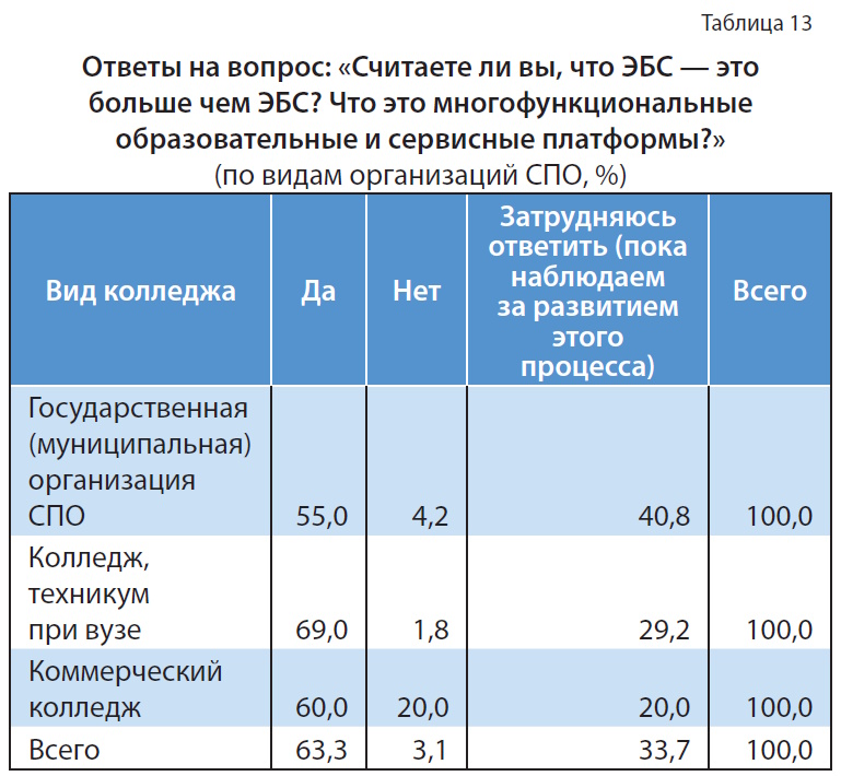 В ходе исследования респондентам было предложено ответить на вопрос: «Считаете ли вы, что ЭБС — это больше чем ЭБС? Что это многофункциональные образовательные и сервисные платформы?» Ответы на него представлены в табл. 13. Анализ показывает, что большинство опрошенных (63,3% согласны с данным утверждением, 3,1% — не согласны, а ещё 33,7% пока наблюдают за развитием процесса. Больше всего положительных оценок ЭБС дали представители вузовских колледжей (69%).