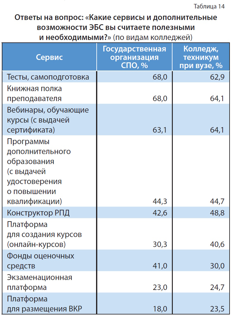Эти опции, как и программы дополнительного образования (с выдачей удостоверения о повышении квалификации), практически одинаково высоко востребованны представителями государственных организаций СПО и вузовских колледжей (табл. 14). При этом такие сервисы, как конструктор рабочих программ дисциплин (РПД), платформа для создания курсов (онлайн-курсов), платформа для размещения выпускных квалификационных работ (ВКР) вполне логично чаще называли представители колледжей при университетах. В то же время фонды оценочных средств более востребованны государственными и муниципальными учреждениями СПО.