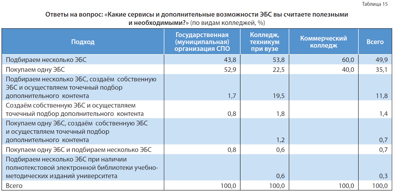 Подходы к обеспечению студентов цифровым контентом характеризуют данные табл. 15. Как показывает анализ, почти половина респондентов подбирают несколько ЭБС. Этот вариант предпочитают 53,8% представителей вузовских колледжей и 60% респондентов из коммерческих образовательных учреждений. 35,1% покупают одну ЭБС: этот вариант отметили 52,9% представителей государственных СПО, 40% респондентов из коммерческих колледжей и 22,5% из вузовских. 14,9% используют сочетание различных подходов.