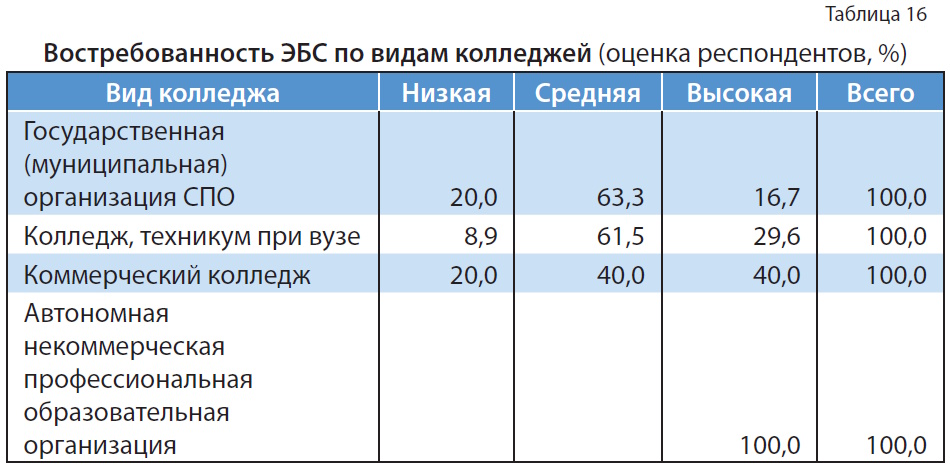 Как показывает анализ табл. 16, респонденты из вузовских и коммерческих колледжей оценивают востребованность ЭБС выше, чем представители государственных (муниципальных) организаций СПО, хотя доля группы «Средняя» для «самостоятельных» и вузовских колледжей примерно одинаковая.