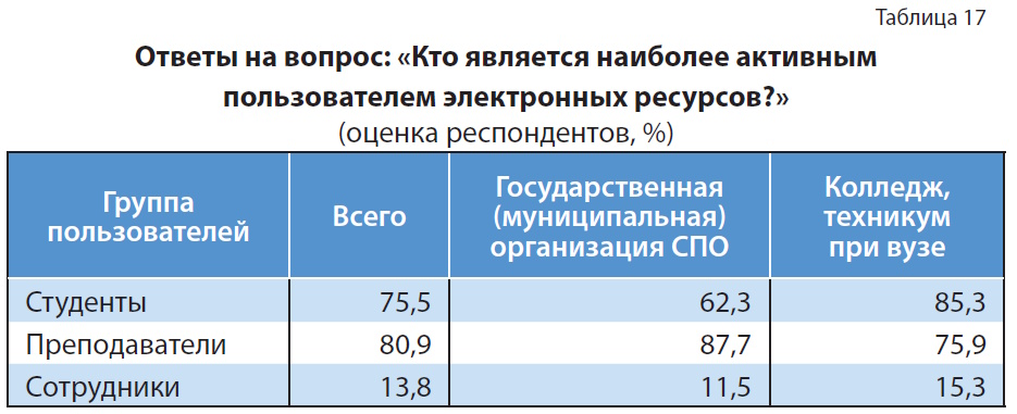 Ответы на вопрос: «Кто является наиболее активным пользователем электронных ресурсов?» — характеризуют данные табл. 17.