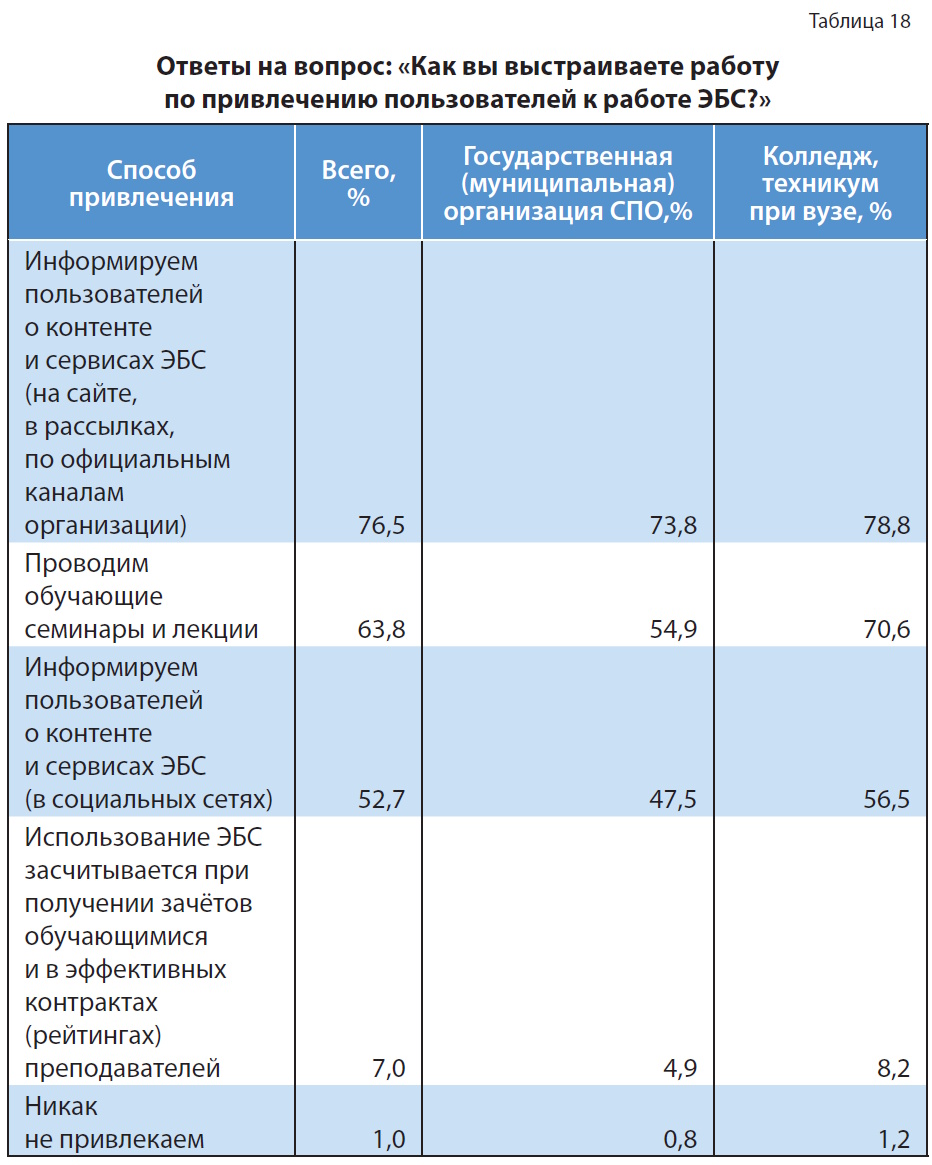 Ответы на вопрос: «Как вы выстраиваете работу по привлечению пользователей к работе ЭБС?» — представлены данными табл. 18. Анализ показывает, что подавляющее большинство респондентов (и в целом, и по видам колледжей) информируют пользователей о контенте и сервисах ЭБС на сайте, в рассылках, по официальным каналам организации. Проводят обучающие семинары и лекции 63,8% опрошенных (70,6% в вузовских колледжах и 54,9% — в «самостоятельных»). 52,7% информируют пользователей о контенте и сервисах ЭБС в социальных сетях.