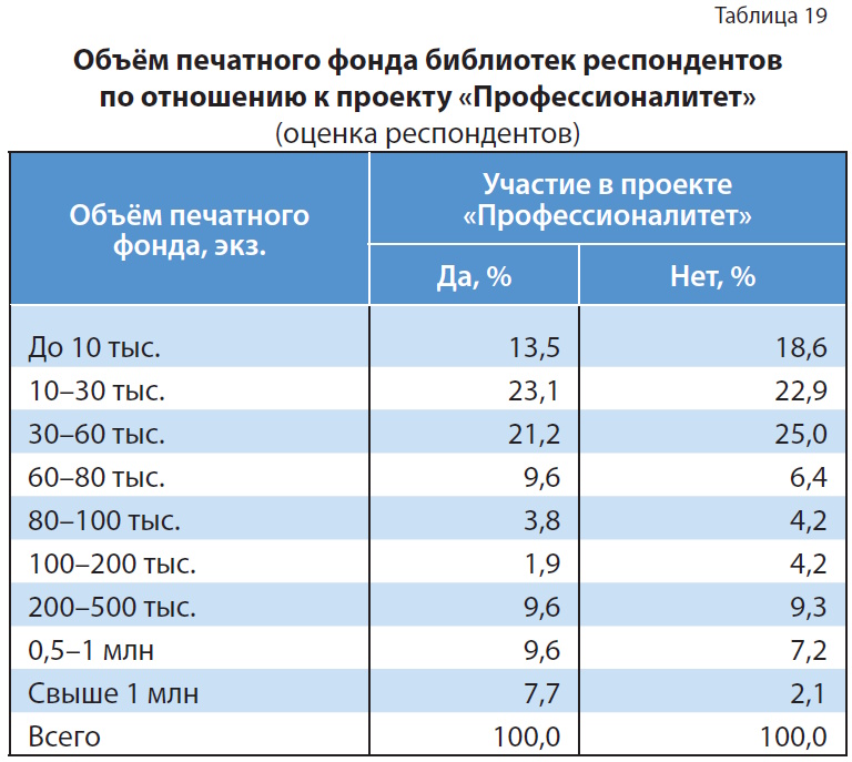 Анализ позволил выявить некоторую зависимость размера фонда от отношения к проекту «Профессионалитет»: у 17,3% участников проекта библиотеки насчитывают свыше 0,5 млн экз., у неучастников тот же объём у 9,3% респондентов. До 60 тыс. экз. включают библиотеки 57,7% участников проекта и 66,5% неучастников (табл. 19).