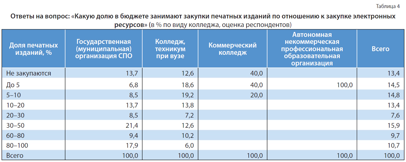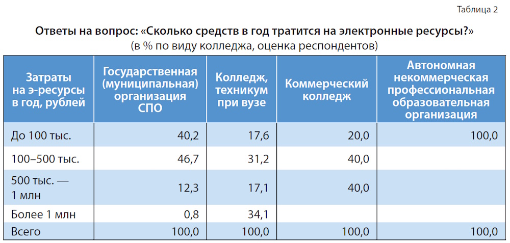 Выборка опроса была представлена в основном двумя группами колледжей: государственными (муниципальными) организациями СПО и колледжами при университетах. И если стратегия комплектования электронными ресурсами и их использования вузовских колледжей в целом похожа на ту, что применяют университеты, то в «самостоятельных» бюджетных учреждениях СПО ситуация иная.