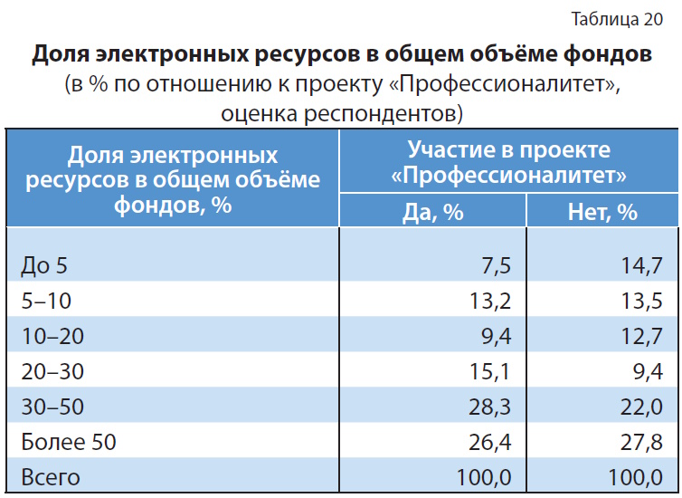 Данные исследования дают возможность предположить, что участники проекта «Профессионалитет» более ориентированы на развитие цифровых ресурсов и учебных библиотек в целом, однако небольшая доля таких респондентов и невозможность с высокой точностью определить принадлежность к проекту не позволяют сделать объективный вывод.