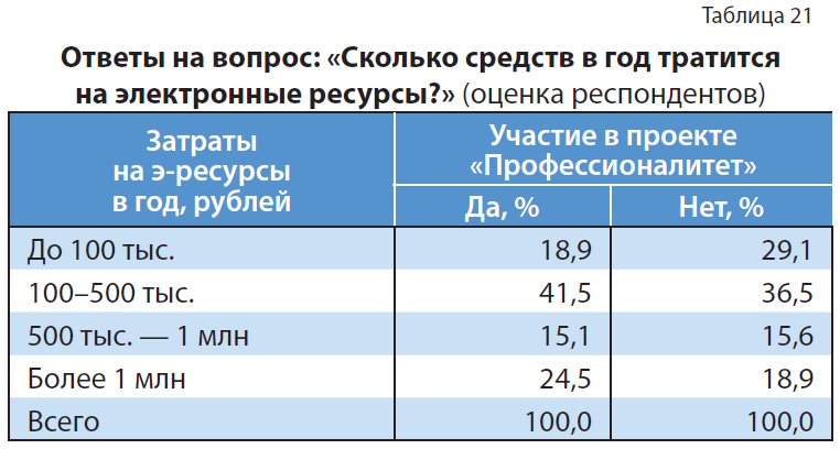 Анализ данных табл. 21 позволяет сделать вывод о том, что участники проекта «Профессионалитет» оценивают свои затраты на электронные ресурсы более высокими цифрами, чем не имеющие к нему отношения респонденты.