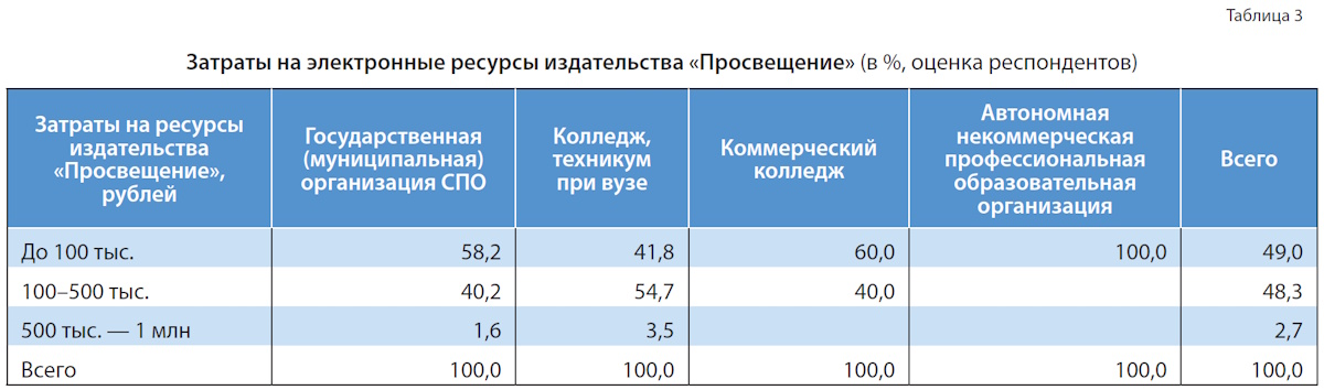 Поскольку организации СПО дают студентам в том числе полное среднее образование, представляет интерес анализ затрат на ресурсы издательства «Просвещение» — монополиста в данном сегменте учебной литературы. Их характеризуют данные табл. 3. Из них следует, что в основном респонденты оценивают свои расходы на эти цели суммами до 500 тыс. рублей, а внутри данной категории (до 100 тыс. рублей и свыше этой суммы) оценки распределились примерно поровну. По понятным причинам вузовские колледжи тратят на ресурсы для среднего образования несколько меньше, чем «самостоятельные» бюджетные и коммерческие организации.