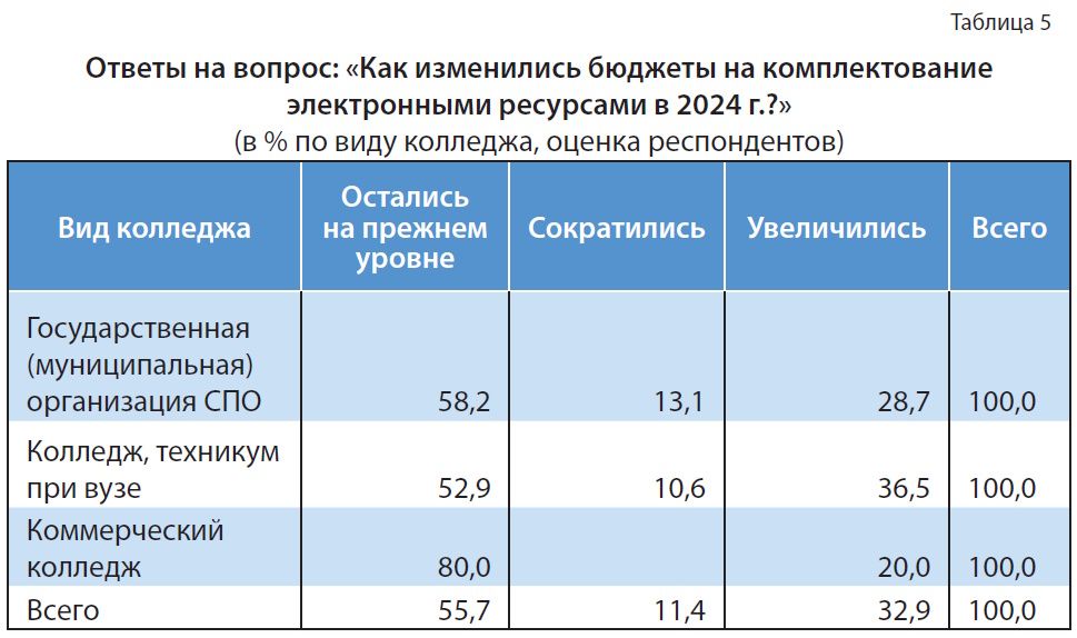 Анализ данных табл. 5 показывает: 55,7% респондентов считают, что бюджеты на комплектование электронными ресурсами в 2024 г. остались на уровне 2023-го, 32,9% — что они увеличились, 11,4% — что сократились. При этом о росте бюджетов заявили 28,7% респондентов из государственных (муниципальных) организаций СПО, 36,5% вузовских колледжей и 20% коммерческих.