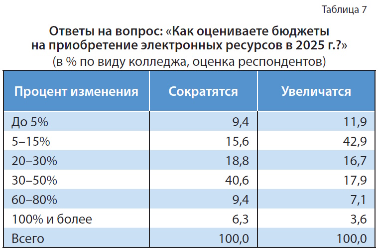 По прогнозам 22,3% опрошенных, в следующем году бюджеты на комплектование цифровым контентом вырастут, 11,3% считают, что они уменьшатся, 66,3% — что останутся на прежнем уровне (табл. 7). Полагают, что бюджеты увеличатся, четверть представителей вузовских колледжей и 17,6% государственных и муниципальных. В основном по всем группам респонденты рассчитывают на то, что бюджеты останутся на уровне текущего года.