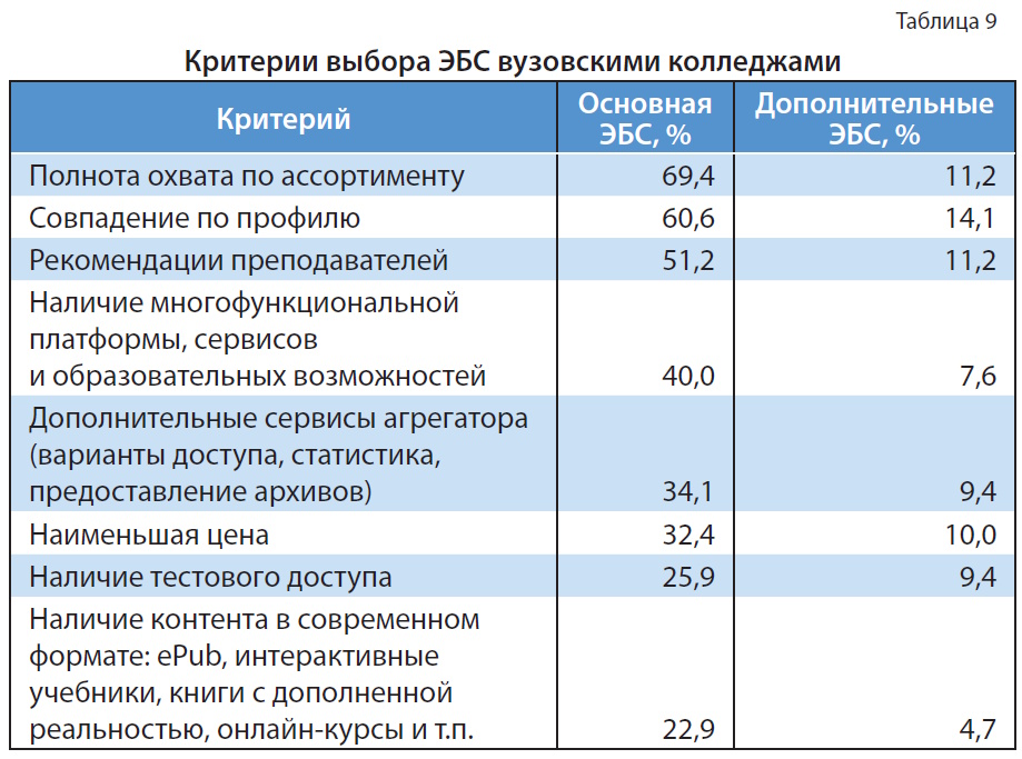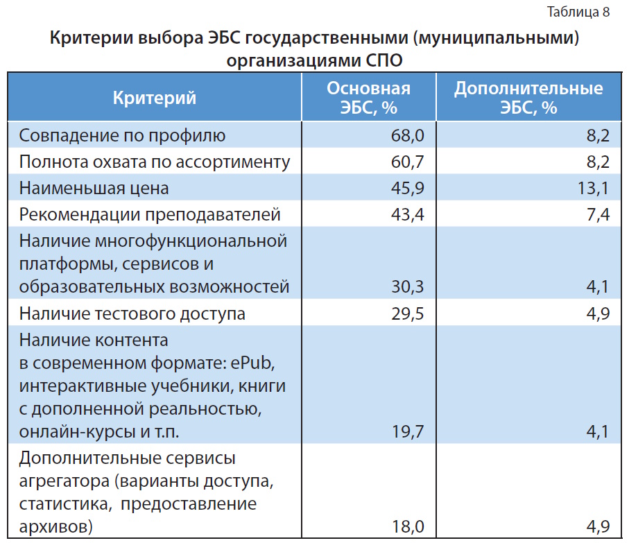 Представляет интерес анализ критериев выбора продуктов агрегаторов цифрового контента респондентами (табл. 8 и 9). И если рейтинг факторов выбора основной ЭБС, называемых респондентами из вузовских колледжей (табл. 9), практически повторяет тот, что был выявлен в процессе анализа предпочтений университетов в 2023 г. (в порядке убывания значимости: полнота охвата по ассортименту, совпадение по профилю, рекомендации преподавателей, наличие многофункциональной платформы и сервисов и т.д.), то у государственных и муниципальных организаций СПО структура критериев выбора иная. Из табл. 8 следует, что для большинства респондентов из «самостоятельных» колледжей (68%) главным фактором покупки основной ЭБС является совпадение по профилю, на втором месте полнота охвата по ассортименту (60,7%), а на третьем — наименьшая цена (45,9%), фактор, который назвали 32,4% вузовских колледжей и 25% университетов. Что касается дополнительных ЭБС, то наименьшая цена на первом месте в числе факторов, обуславливающих выбор «самостоятельных» бюджетных колледжей (13,1%). Для вузовских это совпадение по профилю (14,1%).